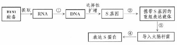 [解析]本题综合考查生物选修三基因工程和细胞工程有关知识,由图可知,①②③④分别是指逆转录、构建基因表达载体、重组载体导入受体细胞和重组基因表达。在导入过程中步骤③可用Ca2+ 处理大肠杆菌,使其处于感受态细胞;检验S基因是否翻译成S蛋白的方法是抗原一抗体杂交实验。制备单克隆抗体比较复杂,这部分内容必须牢记,①用甲流病毒对小鼠进行注射,从产生免疫反应小鼠的脾脏中得到相应的B淋巴细胞;②设法将鼠的骨髓瘤细胞与B淋巴细胞融合,再用特定的选择性培养基进行筛选,得到既能迅速大量繁殖,又能产生专一的抗体的杂交瘤细胞;③对上述杂交瘤细胞,还需进行克隆化培养和抗体检测,经多次筛选,就可获得足够数量的能分泌所需抗体的细胞;④将杂交瘤细胞在体内或体外培养,就可以从中提取出大量的能抗甲流的单克隆抗体了。甲型H1N1流感病毒感染正常人体后能引发特异性免疫反应,产生抗体与病毒结合,进而消灭病毒,该病毒可能会通过发生基因突变而改变传染性