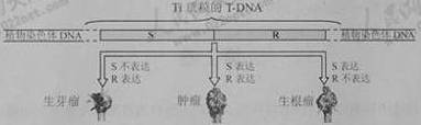 5.(11天津理综卷)土壤农杆菌能将自身Ti的质粒的T-DNA整合到植物染色体DNA上,诱发植物形成肿瘤。T-DNA中含有植物生长素合成酶基因(S)和细胞分裂素合成酶基因(R),它们的表达与否能影响相应植物激素的含量,进而调节肿瘤组织的生长与分化。