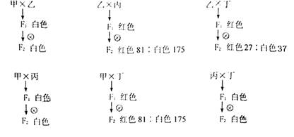 ⑵4对。本实验的乙×丙和甲×丁两个杂交组合中,F2中红色个体占全部个体的比例81/(81+175)=81/256=(3/4)4,根据n对等位基因自由组合且完全显性时,F2中显性个体的比例为(3/4)n,可判断这两个杂交组合中都涉及到4对等位基因。综合杂交组合的实验结果,可进一步判断乙×丙和甲×丁两个杂交组合中所波及的4对等位基因相同。