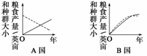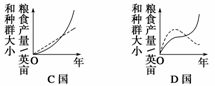 4.下图所示为四个不同国家中,在相同的时间内人口种群大小与每英亩土地粮食产量的关系(实线为种群大小,虚线为粮食产量/英亩)。请问在无粮食进口的情况下,哪一个国家能生存的最长久