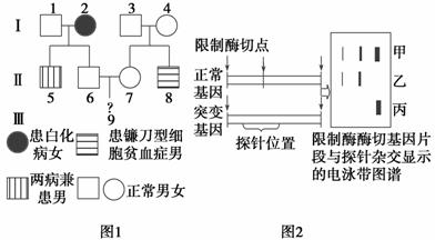 16.人的正常与白化病受基因A和a控制,正常与镰刀型细胞贫血症受基因B和b控制,两对基因分别位于两对常染色体上,假设白化病基因与相对应的正常基因相比,白化病基因缺失了一个限制酶切点,图1表示某家族遗传系谱图,图2表示甲、乙、丙3人白化基因或相对应正