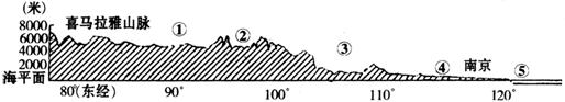 ⑴在剖面图上标出我国三级阶梯的范围(每个1分)