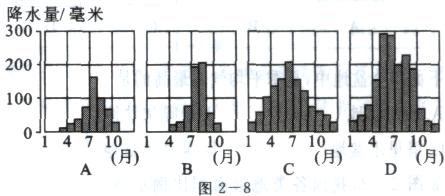 (3)上图A.B,C.D分别为哈尔滨、北京、武汉和广州四城市的降水量柱状图,可以看出,我国降水集中在________季,南方雨季较______(长或短),降水较_____(多或少)。