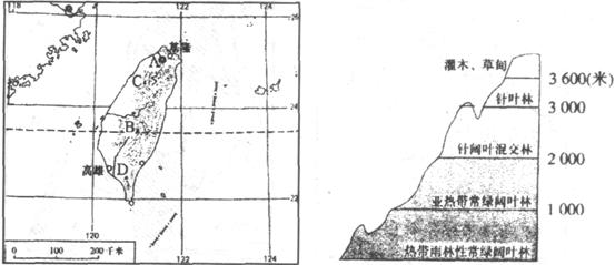 (5)以上右图是台湾山脉某段植被的垂直分布情况,它表示图中的BCD山峰中的哪一座? ________________
