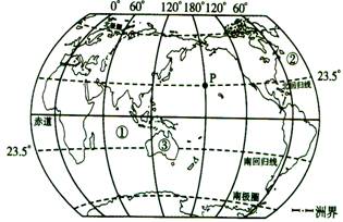 ⑴A是_____洋,围绕其周围的大洲分别是①_______洲,②_______洲,③_______洲。