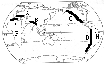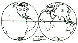 ⑵将代表下列大洲的字母填写在图中恰当位置。A亚洲 B非洲 C南美洲