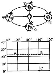 ⑶当太阳直射在A点时,地球位于公转轨道上的_______处,此时北极圈内会出现_________现象。⑷当地球位于公转轨道上的乙处时,北半球处在______季,南半球处在_____季。