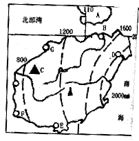 ⑷图中D、E、F、G四处,盛产海盐的是______,该处盛产海盐的条件是______________________著名的热带海滨风光旅游胜地是________,列举该处至少两处旅游景观:____________________⑸在五带中,该岛位于_______带,因而已建成我国最大的________作物基地。主要的热带经济作物有_______________________________________,主要的热带水果有:___________________