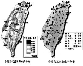 11、读“台湾岛气温和降水的分布图”及“台湾岛工农业生产分布图”,回答。(4分)