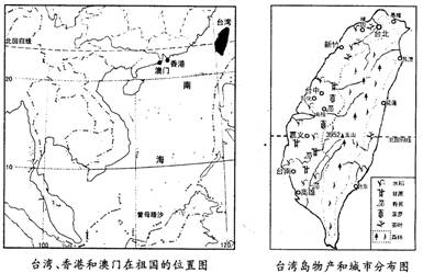 12、下图是台湾、香港和澳门在祖国的位置图和台湾岛物产和城市分布图,据图回答。(10分)