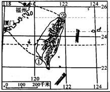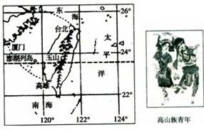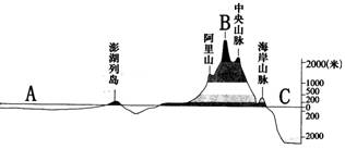 15、 下图分别是“台湾海峡两岸地区略图”(左图)和“台湾岛地形剖面图(沿北回归线附近)”(右图),读图回答下列各题。