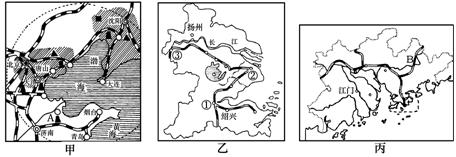(1)甲图中A油田是 ,丙图中铁路线B是 ,2010年世界博览会将在乙图中的 (填图中代号)城市举办。