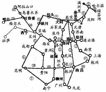 14、读右面中国主要铁路干线分布图,回答下列问题: