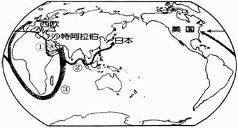 (2)中考资源网图中运输线路 ① 途经阿拉伯海 、 、 地中海 、大西洋,石油主要运往 和 ;线路 ② 经过位于东南亚的重要海峡 ,此运输线被日本称为“ ” ;线路 ③ 绕道非洲南端的 ,主要运往 和 。中考资源网在三条运输路线中,运量最大的是 。中考资源网