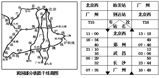 26.小刚同学暑假中准备乘火车从长沙到北京参加夏令营活动,请根据下列“我国部分铁路干线简图”和“北京--广州客运简明时刻表”,回答问题。中考资源网(8分)