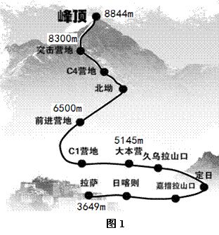 珠穆朗玛峰是世界最高峰,作为世界群山之首,屹立在亚欧板块和印度洋板块碰撞造就的喜玛拉雅山脉群峰之中。北京时间2008年5月8日上午9时11分,北京奥运火炬在珠峰顶点火成功。读图1(珠峰登顶路线)并结合所学知识回答1-4题。