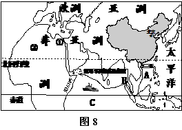 (三) 2008年我国海军护航编队抵达亚丁湾执行护航任务。读图8,回答下列问题:(11分)