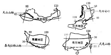 读我国四大区域及部分山脉分布示意图,回答19-20题: