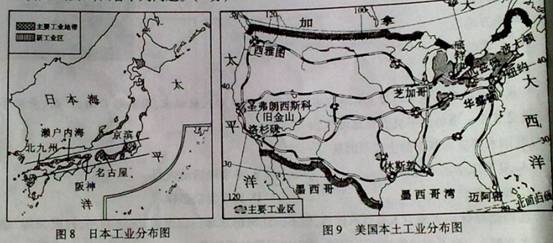 (2)日本工业区主要分布在 沿岸和 沿岸;美国东北部工业区主要集中分布在 洋沿岸和五大湖沿岸。两者共同特点是都有便利的 条件。