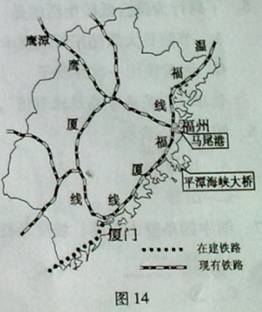 31、2010年4月26日,福厦高速铁路通车。日益完善的海陆空交通运输网络,对于促进海峡西岸的经济建设,具有十分重要的意义,读图14,回答下列问题