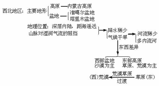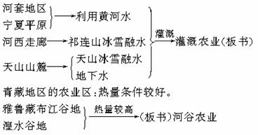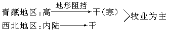 1.西北地区与青藏地区自然特征有相似的一面:(缺水)由于水分的制约,这两个地区不能像北方、南方地区那样以耕作业为主,而是以畜牧业为主。