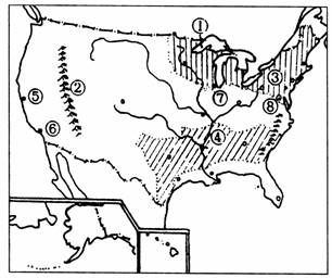 ⑵读图回答:①是____湖,该湖附近盛产____矿;②是____山脉,该山脉属于____山系;⑦是____市,该城市主要的工业部门____是;⑧是____市,该城市按照行政区划应属于____特区。