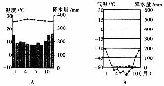[解析]本题中主要考查了某地区气温和降水的分布状况,根据气温变化曲线图和降水量柱状图可以得出A、B两地年温差较大的是B地,降水量较多的是A地,A地位于热带,而B地位于南寒带;A地的气候特征是全年高温多雨,而B地的气候特征是全年低温少雨。