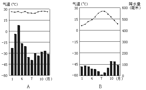 (2) A、B两地中属于冬雨夏干的是__ ,终年多雨的是____ ____。