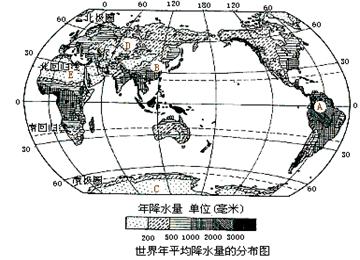 (1)图中A、C两地降水量的差异反映了世界年降水量的分布特点是____ ____。