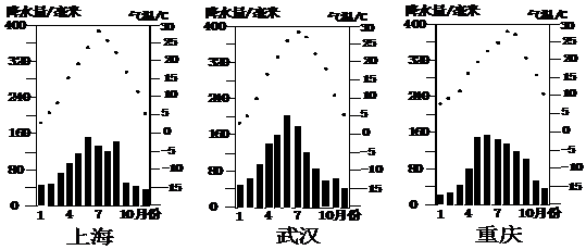 46、读上海、武汉、重庆气温变化曲线与降水量柱状图,回答下列问题: