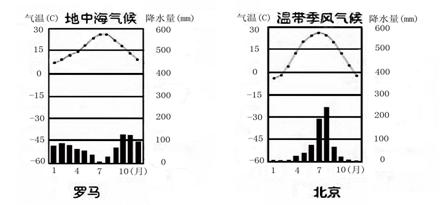 (1)罗马气温最高月出现在 月,降水量较多的季节为 季。所以,该气候特点是冬季 ,夏季 。如果你冬季去罗马旅游,应该带的生活用品是 。