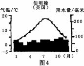 读图4,“伯明翰(英国)年内各月气温降水量图”回答3-4题: