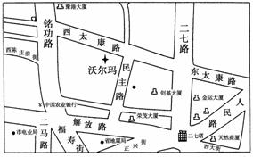 (2010·郑州模拟)全球零售业老大沃尔玛在郑州的第二家店(紧邻郑州市商业中心二七广场)开门迎客。读沃尔玛二七店位置示意图,回答10-11题。
