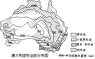 (2)读图可知:小麦--养羊业主要分布在澳大利亚