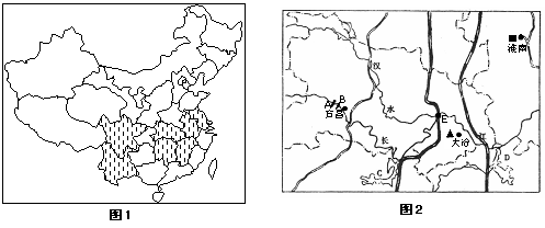 (2)图2中字母A、B表示三峡水库所在位置的是 。(2分)E城市形成的