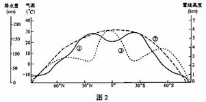 雪线高度是指终年积雪下限的海拔。图2表示全球不同纬度多年平均雪线高度、气温、降水量的分布。读图2,回答3-5题。