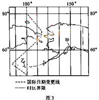 据报道,哈尔滨地区2004年10月14日出现的日偏食开始于9时20分,结束于10时57分。当哈尔滨日食结束时,美国阿拉斯加州某地为13日16时57分。那里人们看到的日偏食开始于13日17时55分,结束于13日18时46分。读图3,完成9-11题。