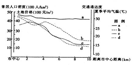 下图为我国长江三角洲地区某城市人口密度、土地价格、交通通达度、夏季平均气温变化图,读图回答10----11题