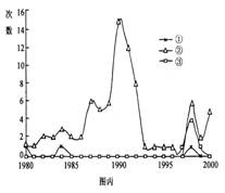 (2)、图丙为1980~~2000年图甲中①、②、③三地各年赤潮发生次数曲线图,试分析②地赤潮发生次数多的原因______________________________。