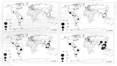 材料一:美国跨国公司在发展中国家R&D投资的空间演化示意图