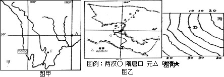 走向。请在图丙中相应的位置用“ ”绘出图甲阴影地区所示的河流的干流。根据有关资料显示,图丙中等温线所示季节C地的降水往往比附近的D和E地少很多,请简要分析原因。