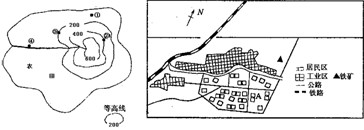 (3)乙图是岛屿开发后,形成的一个中等城市示意图,你认为该市在甲图的①②③④处最有可能的是 处。理由是 。如果该市工业布局从环境保护和资源利用角度看都是合理的,那么该地常年主导风向应是 。从图中可以看出:该工业区位除了考虑风向外,还考虑了两个重要区位因素① ,原因 ;② ,原因 。
