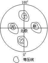 下图为北半球大气活动中心分布示意图,读图回答1-4题