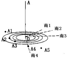 某日,一地理兴趣小组在操场测量太阳高度:在巨型圆靶(下图中的圆是以0为圆心,不同长度为半径的同心圆)上竖了一根竿子,A1、A2、A3、A4、A5分别是秆子顶点A在北京时间10:40、11:20、12:00、12:40、13:20观测时的轨迹)。回答8-9题