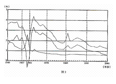 图3为我国1949~2001年的人口发展变化曲线图,图中曲线分别代表出生率、死亡率和自然增长率。读图3,回答5~6题。