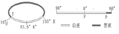 下图为某日某时刻30°N纬线圈和72.5°E经线的昼夜分布状况,据图中信息回答7--8题