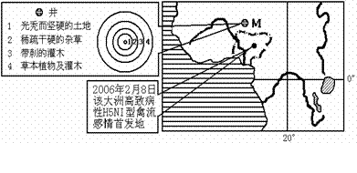 10.若某生态学家在调查中发现图中M点及周边植被景观分布近似于图左侧上图部分所示(注:大圆的直径约2-4千米),导致这一现象的原因是( )