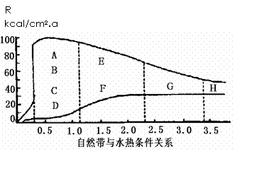 8.读图9“自然带与水热条件关系”,A-H表示不同的自然带。关于图中自然带的描述,正确的是(R为年幅射差额,即热量收入;R/Lr为干燥指数,指数越大,表示越干燥) ( )