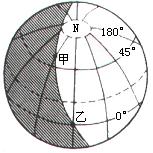 ⑴在图甲中画出晨昏线的另一部分,并将其转绘在图乙上,再在图乙中画出夜半球的范围(用阴影)。
