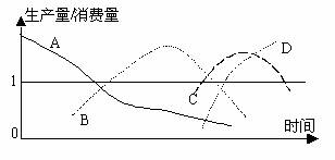 下图是某企业产品在A、B、C、D四国的生产量与消费量比值变化示意图,据此完成1-3题: